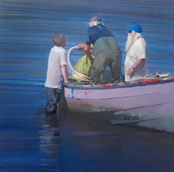 The Catch. Oil on canvas, 86 x 86 cm. Exhibited at the Mall Galleries London with the Royal Society of Marine Artists.